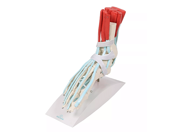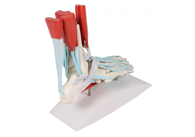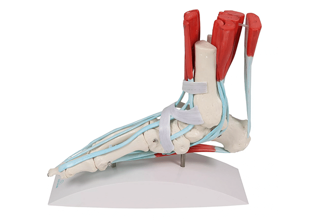 Squelette du pied humain avec représentation du ligaments et muscle.